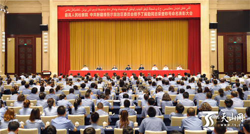 9月5日上午,最高人民检察院、自治区党委在乌鲁木齐召开命名表彰大会,授予昌吉回族自治州人民检察院党组成员、副检察长丁殿勤同志“全国模范检察官”和“自治区民族团结进步优秀共产党员”荣誉称号。最高人民检察院党组书记、检察长曹建明,自治区党委书记陈全国出席大会并讲话。新疆日报记者 卢民一 摄