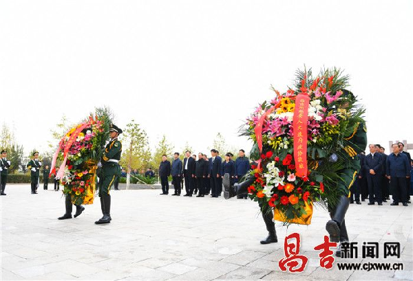 州党委常委、昌吉市委书记孟凡刚宣读祭文。少年儿童们面向革命烈士纪念碑,唱响《我们是社会主义接班人》,高举右手,齐致队礼。伴随着深情的《献花曲》,4名武警战士抬起花篮,缓步走向革命烈士纪念碑,将花篮摆放到纪念碑基座上。花篮的红色缎带上写着“革命烈士永垂不朽”8个金色大字。随后,全体人员向革命烈士纪念碑三鞠躬,并绕行瞻仰革命烈士纪念碑。
